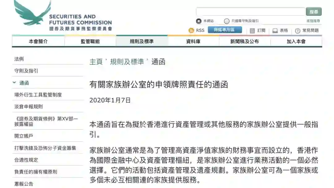 2020年1月7日,就在新加坡发布新的GIP投资移民细则之后的几天,香港证券及期货事务监察委员会(SFC,香港证监会)在官网发布《有关家族办公室的申领牌照责任的通函》。