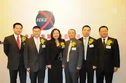 2009年11月龙湖地产挂牌上市首日的吴亚军(左三)、蔡奎(左四) 来源:腾讯大渝网