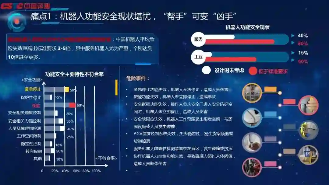 据赛迪机器人检测认证中心CR测试部测试结果统计:国内机器人功能安全现状堪忧,平均危险失效率高出标准要求3-5倍,其中服务机器人尤为严重,个别达到10倍甚至更多。