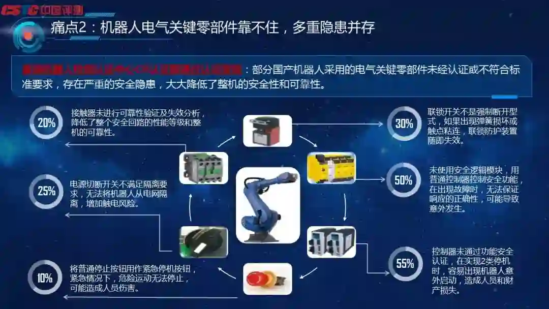 赛迪机器人检测认证中心CR认证部通过认证发现:部分国产机器人采用的电气关键零部件未经认证或不符合标准要求,存在严重的安全隐患,大大降低了整机的安全性和可靠性。