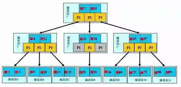 如上图,是一颗b+树,关于b+树的定义可以参见B+树,这里只说一些重点,浅蓝色的块我们称之为一个磁盘块,可以看到每个磁盘块包含几个数据项(深蓝色所示)和指针(黄色所示),如磁盘块1包含数据项17和35,包含指针P1、P2、P3,P1表示小于17的磁盘块,P2表示在17和35之间的磁盘块,P3表示大于35的磁盘块。真实的数据存在于叶子节点即3、5、9、10、13、15、28、29、36、60、75、79、90、99。非叶子节点只不存储真实的数据,只存储指引搜索方向的数据项,如17、35并不真实存在于数据表中。