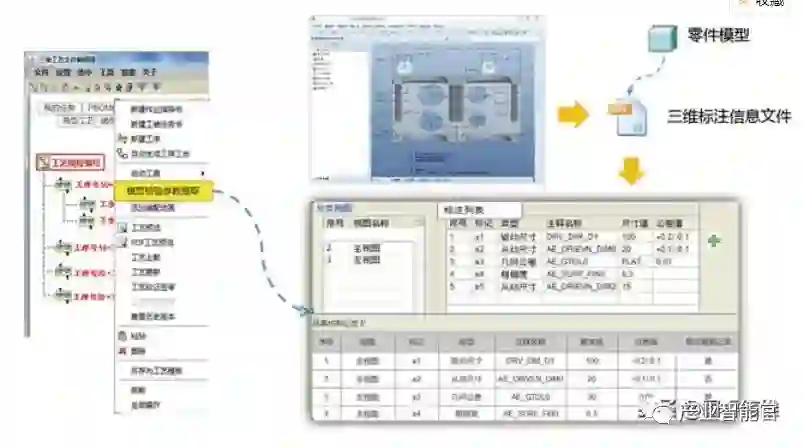 在结构化工艺设计过程中,支持从PDM系统获取MBD模型各视图尺寸标注信息文件进行解析,选择结构化的检验参数,作为车间现场实物检测记录的输入,确保检验尺寸要求信息的准确性。从MBD模型提取的检验参数可以与工艺编辑器可视化区域的三维轻量化模型中的视图与尺寸双向联动,方便工艺工程师的识别