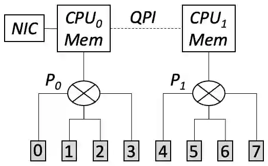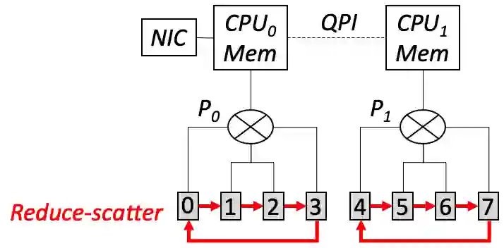 此时,两个 NUMA node 的主机内存上各自有一份大小为 M 的梯度。我们再利用 CPU 将这两份梯度做一次聚合。但是这个过程的传输只发生在带宽较大的 QPI 上(>300Gbps),并不会产生瓶颈。于是这一系列步骤不但实现了预期中的梯度聚合效果,还使瓶颈链路的传输量从 7M/4 降低为 M,显著降低了通信时间。这里的核心设计原则是:尽量避免跨 NUMA GPU 的直接通信,而可以利用 CPU 的聚合能力来间接完成。