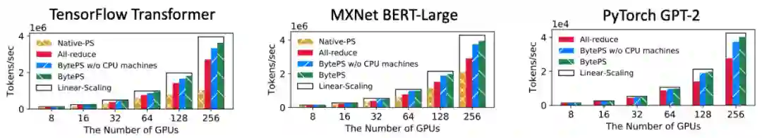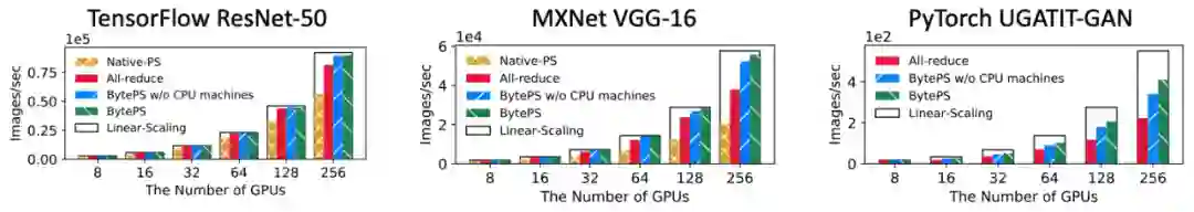 BytePS 对多种 CV 类(包括 ResNet-50,VGG-16 ,GAN)和 NLP 类(Transformer,BERT-Large,GPT-2)模型都做了分布式性能评测,规模从 8 卡 - 256 卡。所使用的硬件是 V100 GPU 和 100Gbps RDMA 网络。对照组为目前广泛使用的 All-reduce 和原生 PS 实现。