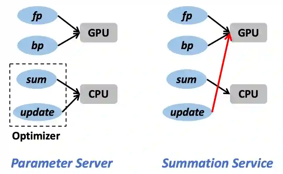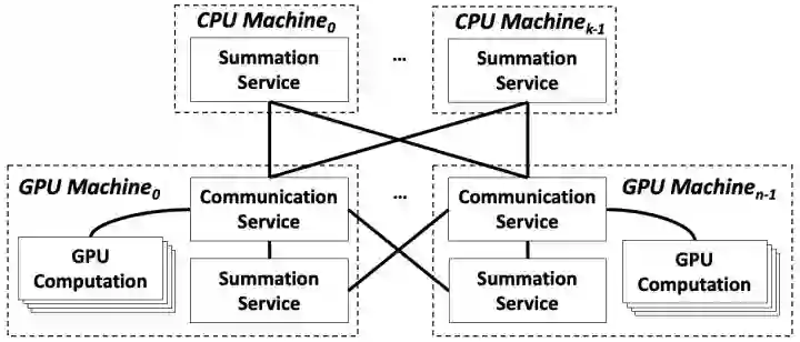每台 GPU/CPU 机器上部署了一个 Summation Service 模块,处理来自其他 GPU 机器的梯度,其能够高效运行在 CPU 上。
