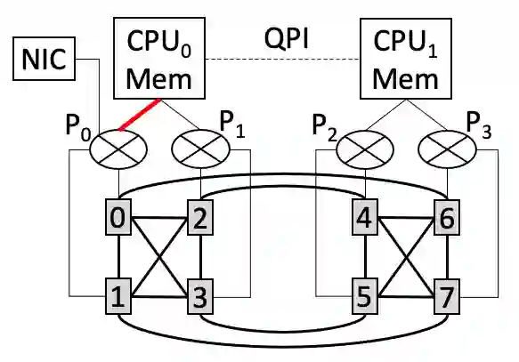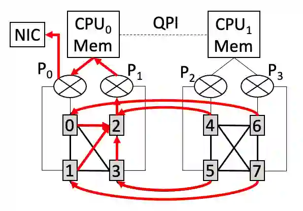 图 9 是 NVLink-based 机型的示意图。对于这种拓扑,GPU 之间可以通过超高带宽的 NVLink 链路进行通信。由于 NVLink 带宽显著大于 PCIe 带宽,PCIe 瓶颈问题显得更加严重。可以看到,图 9 中 P0-CPU0 链路(标红色的线段)会同时被以下两种传输同时竞争:(1)CPU0 的内存往 GPU0/GPU1 拷贝数据;(2)CPU0 的内存往网卡 NIC 发送数据。由于 P0-CPU0 链路的带宽与网卡带宽很接近,这种竞争会导致网卡无法发挥最大带宽。