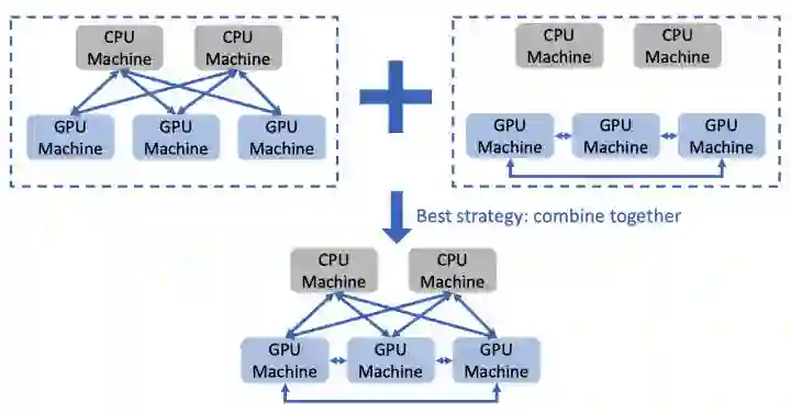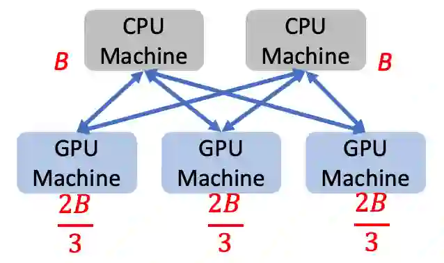 (2)All-reduce 仅利用了 GPU 机器之间的带宽。此时,GPU 机器与 CPU 机器之间的带宽未得到利用。