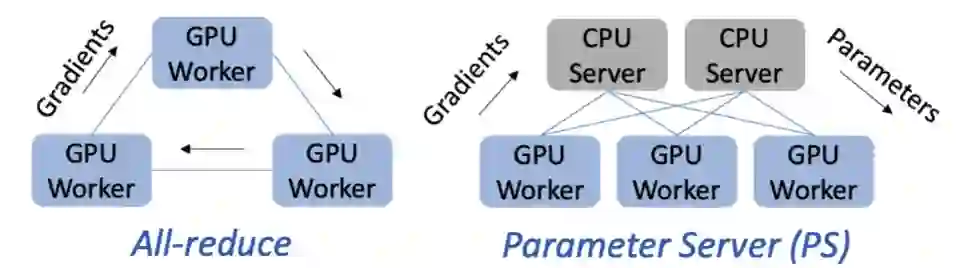 PS 架构则包含 GPU worker 和 CPU server。迭代过程中,GPU worker 将梯度传输至 CPU server;后者将接收到的不同 workers 的梯度做聚合,然后执行 DNN 优化器(如 RMSProp 或 Adam 等)并将更新后的参数传输回 GPU workers。