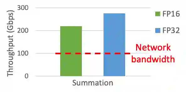 经分析,优化器可被拆解为两部分:(1)Sum:将来自其他 GPU workers 的梯度求和并得到一份聚合后的新梯度;(2)Update:利用新梯度对参数进行更新。后者对于 CPU 而言的确是非常消耗内存带宽的操作,但前者却能够在 CPU 上高效实现(例如 AVX 指令集)。如图 11 所示,求和操作在 CPU 上可以达到远超网络带宽的吞吐率,即不会引入 CPU 瓶颈。