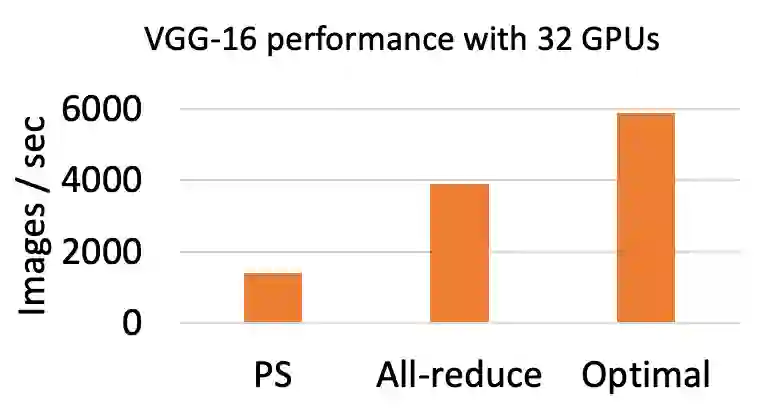 如下图所示,目前的 All-reduce 和 PS 架构在训练性能上距离最优情况都有较大差距。