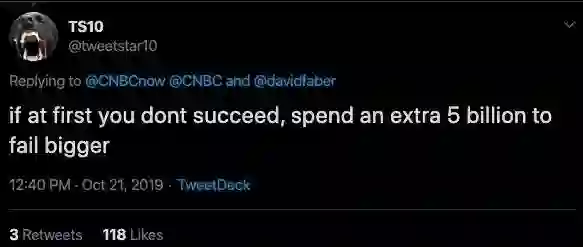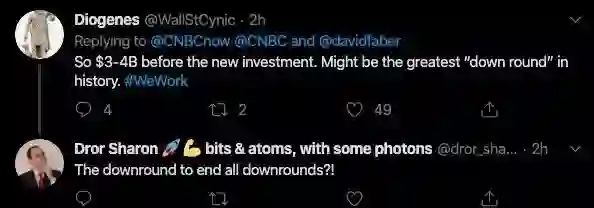 软银从阿里巴巴赚到的钱都要亏在 WeWork 身上了。 就在所有人都在等着看 WeWork这一个上市闹剧 怎么收场时,10 月 21 日美国时间周一,消息突然传出: 软银要出手接盘了。 据 CNBC、《华尔街日报》等援引知情人士透露,软银接管共享办公创业公司 WeWork(现已更名为 The We Company)的谈判,已经临近尾声,结果最快可能于周二宣布。 谈判结果就是: 软银计划在 WeWork 身上再投资 40 到 50 亿美元,最终控股80%。 是的,你没有看错,在Wework身上已经血亏的软银,要继续在它身上放更多钱…… 但软银也是有苦说不出来,因为Wework当下估值仅仅为 75 至 80 亿美元,比今年年初启动上市前的470-480 亿美元、预估上市时的600亿美元,缩水了不是一星半点。 重点总结一下就是:软银前前后后花了150亿美元左右,买一个价值80亿美元公司的不到80%的股份…… 来看下这笔交易爆出来的细节:软银新投资额将由两部分组成: 约 15 亿美元,来自于软银 2018 年底以认股权证 (Warrant) 方式对 WeWork 的投资,现在加速到账(并为软银转化成优先股)。 约 30 亿美元,从现有股东,包括公司高管、员工和其他投资者的手中收购老股; 除了追加的投资之外,软银还联合了瑞穗集团为 WeWork 提供: 约 50 亿美元银团贷款。 消息源透露,WeWork 的估值在 75 至 80 亿美元左右。 在 WeWork 启动上市流程之前,软银在 WeWork 占股不到 20%,是 CEO 亚当·纽曼 (Adam Neumann) 之后的第二大股东和第一大外部股东。 如果本轮投资完成,软银将持有 WeWork 70%到80%的股份。 需要注明的是, 软银对 WeWork 的接盘的成功概率并非百分之百。 《纽约时报》报道,WeWork 董事会仍在考虑另一项来自摩根大通领导的财团的收购计划,总额 50 亿美元左右。 WeWork 董事会将在美国时间周二完成投票,确定最终选择软银还是摩根大通。 此前,WeWork 在今年前六个月的运营亏损高达 14 亿美元,即将现金流断裂,险些破产。 上周有消息称,WeWork 将会裁员至少 2,000 人。 目前,WeWork 的所有企业和个人客户,按人头计算超过 52 万人。 通过巨额的现金注入,软银希望能够让 WeWork 加快实现 1)盈利; 2)正自由现金流的速度。 如果软银的接盘计划成功,其首席运营官 Marcelo Claure 将成为 WeWork 的董事长。 《金融时报》报道,纽曼的持股比例将进一步降低至 10%以下。 此前纽曼通过三重股票结构掌握的绝对多数投票权,也将转变为和持股比例相等。 纽曼已经在本月辞任 CEO。 该公司原总裁兼联合首席运营官阿迪·敏森 (Artie Minson),和原副董事长塞巴斯蒂安·甘宁汉 (Sebastian Gunningham) 共同担任联席 CEO。 2019 年初,WeWork 的估值一度高达 470-480 亿美元。 该公司的上市计划(已经失败并撤回)本可能将市值推到至少 600 亿美元。 由于在 IPO 期间,WeWork 在企业治理、财务安排等方面隐藏已久的丑闻终于真相大白,公司估值大跌。 该公司此前已完成(并未全部到账)的 128 亿美元融资额,其中有 106.5 亿来自软银。 网友开玩笑说,软银从阿里巴巴赚到的钱都要亏在 WeWork 身上了…… 本轮投资的主体将会是软银,而非沙特主权基金重度参与的软银愿景基金 (SoftBank Vision Fund)。 WeWork 80 亿美元的估值,还不如软银之前已经给到它的钱多。 堪称史上流血最多的一次流血融资。有人将其形容为 the down round end all down rounds…… 更有人吐槽: 因为软银已经投资了 106 亿美元,又追加了 50 亿(实际上新追加的部分约 30 亿),“难道软银已经拥有 WeWork 160% 的股权了? ” 有网友吐槽软银的投资策略,“如果你最一开始没有成功,那就再投 50 亿美元,输也要输个大的。 ” 觉得荒谬?这里还有更多 软银和它催肥的美国独角兽巨婴 的故事。 转载声明:本文授权转载自「硅星人」,搜索「guixingren123」即可关注。作者:光谱