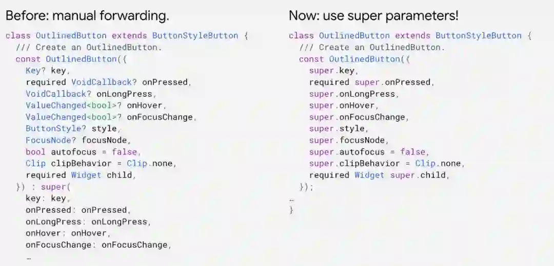 类似: 也许我们可以这样解决问题,即引入新的构造方式,来表示超类中已指定一个参数。我们认为这个想法不错,所以将其添加在 Dart 2.17 中。从下面的示例中不难看出,这尤其与 Flutter widget 代码密切相关。实际上,在我们将这项新特性应用到 Flutter 框架后,代码总共