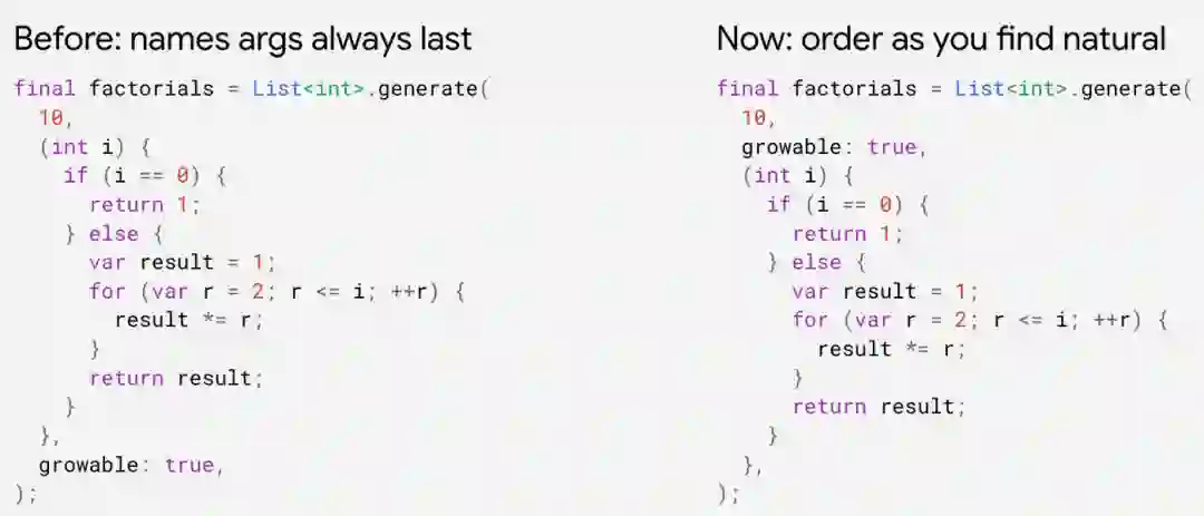 构造函数的调用为例: 之前,growable 参数必须放在最后,因为它位于含生成器的大型位置参数之后,很容易在阅读时被错过。而现在,您可以根据喜好排列参数,先放置小型命名参数,最后再放置带生成器的参数。