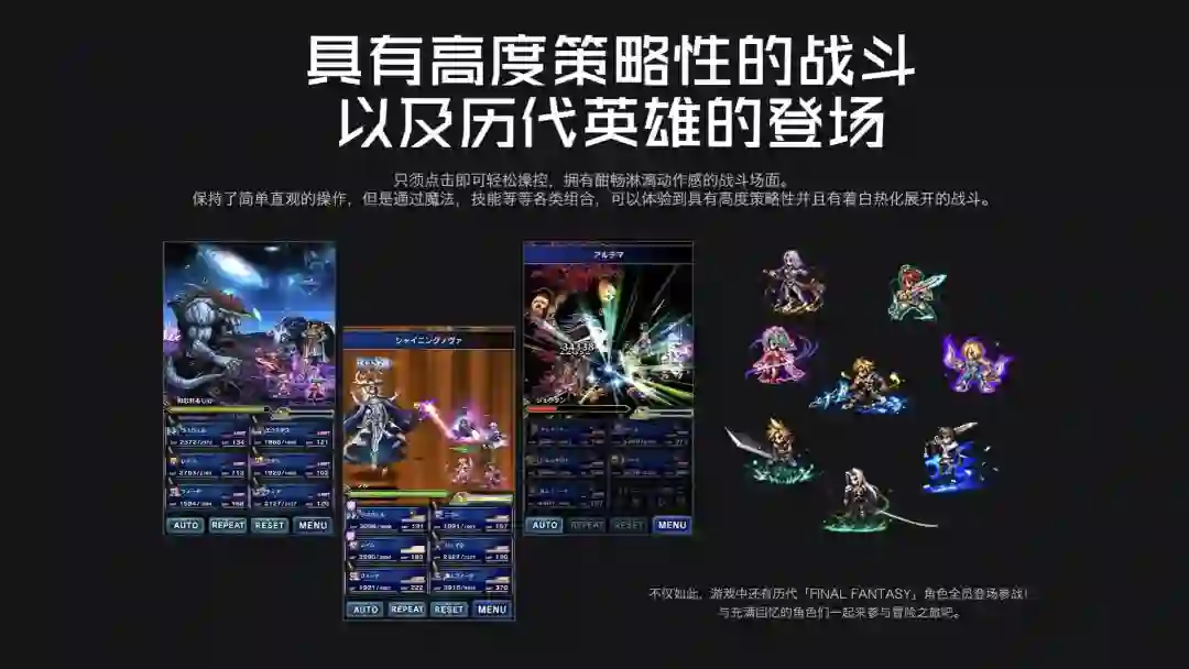 FFBE无疑是一款回归初心的致敬三十年经典之作,正如主制作人广野启所说,不仅重回早期“最终幻想”系列玩家们所熟悉的“水晶物语”,还设置了多样的玩法模式,让玩家们能再度回味水晶系列感人的故事剧情、城镇街道的探索冒险与爽快刺激的战斗乐趣,此外,贯穿历代“最终幻想”的部分人气角色会在本作中登场。