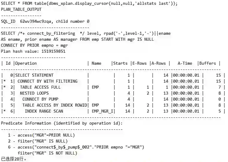 接下来的例子比较经典,请看Id=2和Id=3处,这里显然是联合型,不过我们再观察,Id=2处的A-Rows为10,Id=3处的Starts=10,说明EMP访问的结果集返回多少条,DEPT表就被访问多少次,这是有关联的,这就是联合型的关联型。请回头再看看联合型的非关联型,应该可以明白。