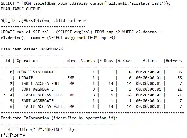 原来如此,FILTER其实对比NESTED LOOPS是一种优化,驱动表返回多少条不重复记录,被驱动表被访问多少次,请注意“不重复”三个字。接下来还有UPDATE的执行计划,由于其和FILTER类似,这里就不做说明了。