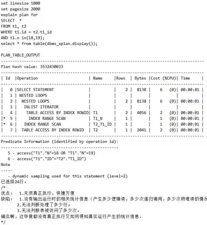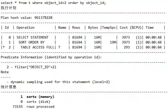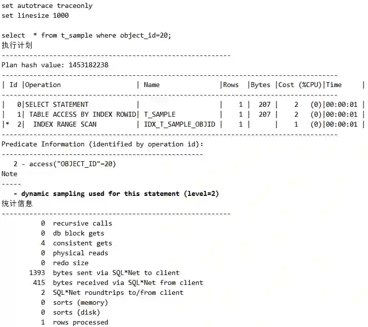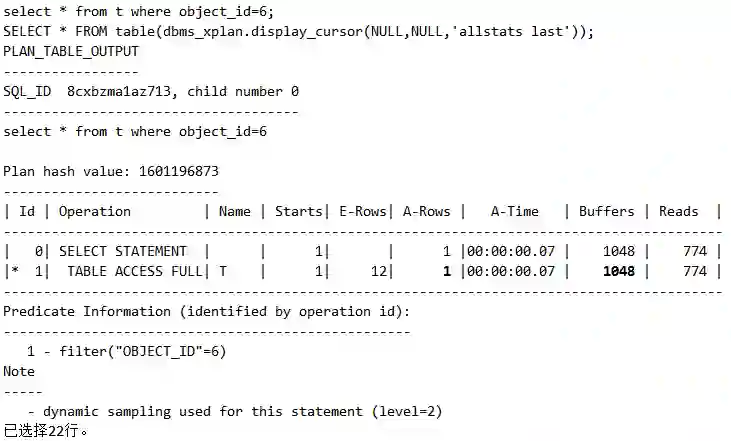 请注意看这个dynamic sampling used for this statement (level=2),这是啥呢?这就是动态采样,当一张表是新建表时,Oracle只好动态地收集这个表的相关信息。然后等到晚上10点,再将其收集到数据字典中。