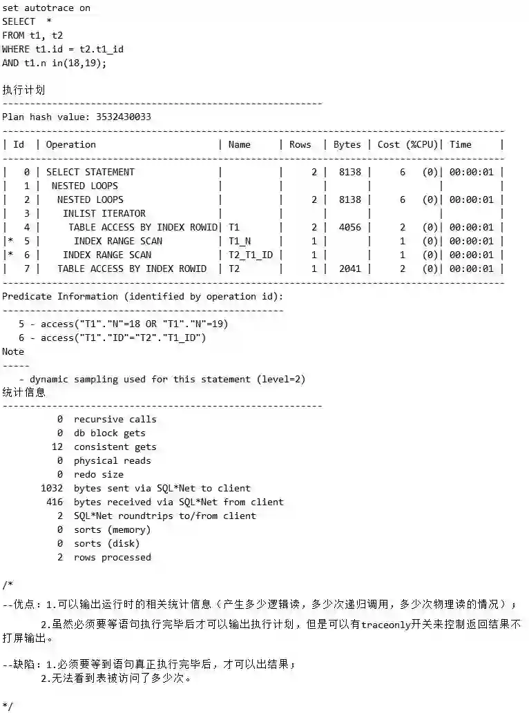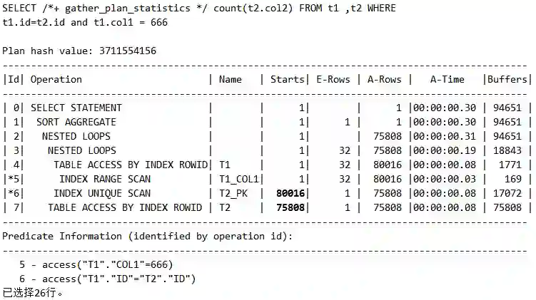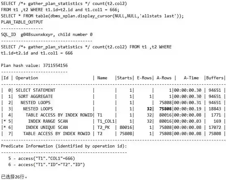 可以看出,t1表比t2表小很多,这时Oracle 就会选择让该SQL的执行计划先访问t1表,再访问t2表。不过问题来了,这Oracle 如何知道这个数据呢?难道也是count(*)一把吗?