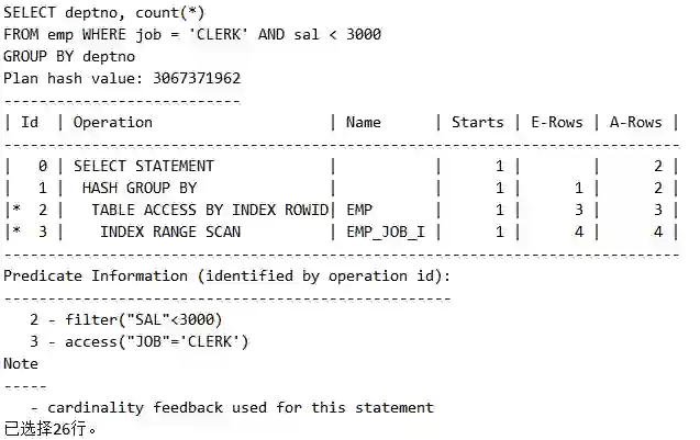 请看下面SQL执行计划Id=3处,通过索引定位JOB='CLERK',然后观察Id=2处,通过rowid回到表中得到sal等其它列,然后根据sal<3000的条件再过滤部分数据。最后完成了deptno动作,请看Id=1处。