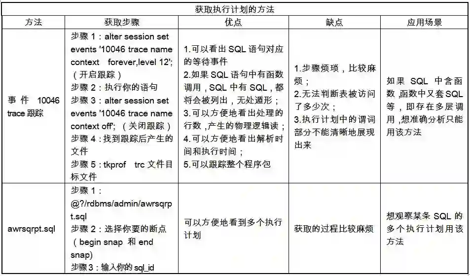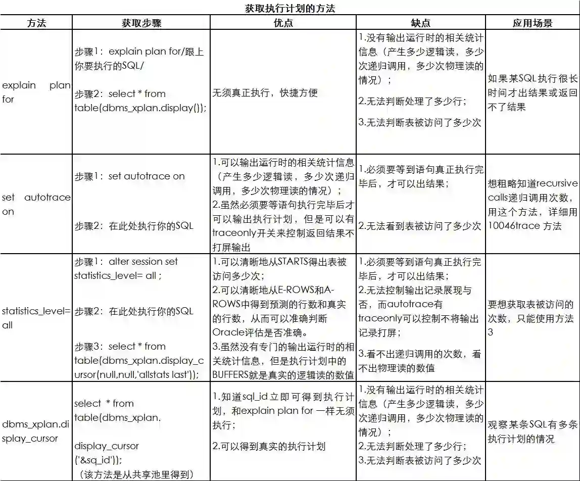 前面大家看到set autotrace on关键字,这是获取执行计划的方法。实际上,在Oracle里获取执行计划的方法有6种。这听起来是不是有些吓人?实际上这些方法各有侧重点,下面一一细看这些方法。