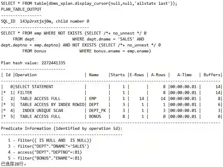 现在,无论多复杂的示意图,我们应该都不会害怕了,都可以轻易地画出执行顺序了。接下来我们对知识进行一个拓展,其实关联型的联合型不见得就一定如同NESTED LOOPS模式一样,驱动表返回多少条,被驱动表就被访问多少次。还有FILTER的模式也是关联型的联合型,具体就有差异,接下来请看下面的例子。