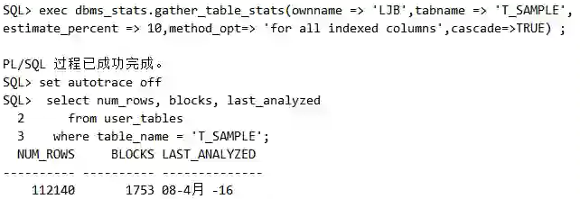 构造环境,新建一张T_SAMPLE表,发现统计信息果然没有被收集,对应的NUM_ROWS BLOCKS和LAST_ANALYZED都是空的。