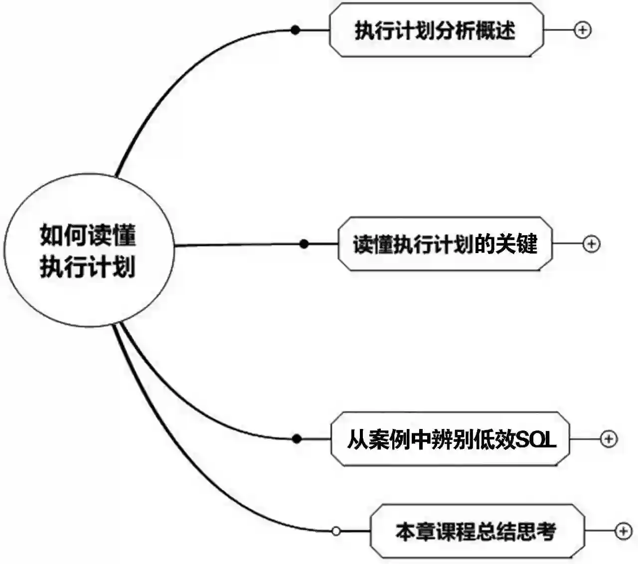 执行计划是什么?如何读懂执行计划?读懂执行计划对我们又有什么用?面对这些疑问,我们从执行计划分析概述、读懂执行计划的关键、从案例中辨别低效SQL、总结思考这四部分入手开始本章的学习分享,如下图所示: