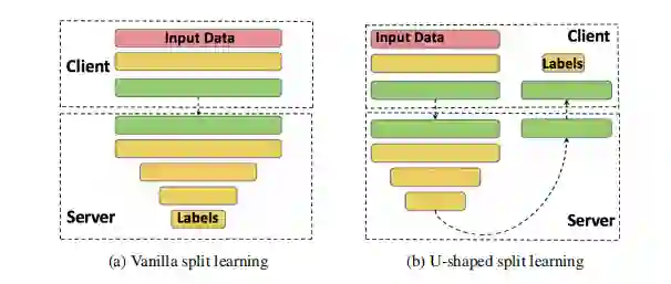 分割学习的关键思想是在客户端和服务器之间执行基于每层的分割模型,并应用于训练和推理。分裂学习最简单配置是每个客户端计算通过深层网络前向传递,然后切割层的输出,即粉碎数据被发送到另一个服务器或客户端,然后由此服务器或客户端完成剩余的计算。这意味着让不共享的数据发生前向传播;最后可以以类似的方式将梯度从其最后一层反向传播到切割层。注意此过程会一直持续到收敛。