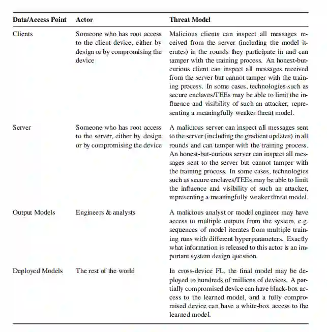 论文中在这一章对现有的成果进行了概述,并介绍了如何设计,才能够提供严格隐私保障,以及现在联合学习系统所面临的挑战。当然,除了针对用户隐私的攻击之外,还有其他类别的针对联合学习的攻击;例如,对手可能试图根本阻止模型训练,或者试图让模型产生偏见。