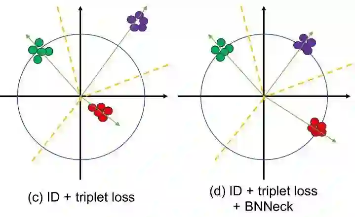 通过神经网络提取特征ft用于Triplet loss,然后通过一个BN层变成了fi,在训练时,分别使用ft和fi来优化这个网络,由于BN层的加入,ID loss就更容易收敛,另外,BNNeck也减少了ID loss对于ft优化的限制,从而使得Triplet loss也变得容易收敛了。因为超球体几乎是对称的坐标轴的原点,BNNECK的另一个技巧是去除分类器fc层的偏差,这个偏差会限制分类的超球面。在测试时,使用fi作为ReID的特征提取结果,这是由于Cosine距离相比欧氏距离更加有效的原因。