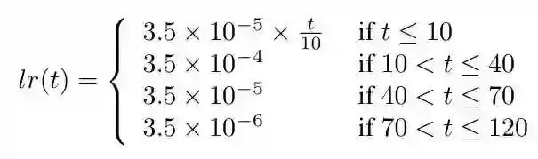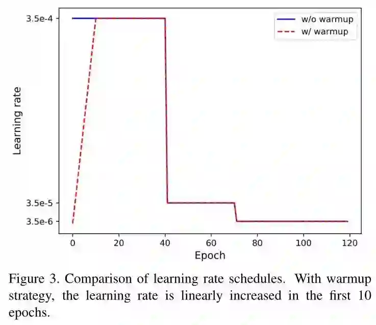 使用Adam方法进行优化,一开始学习率为3.5e-4,在40和70个epoch分别降低为原来的10%,共训练120个epoch
