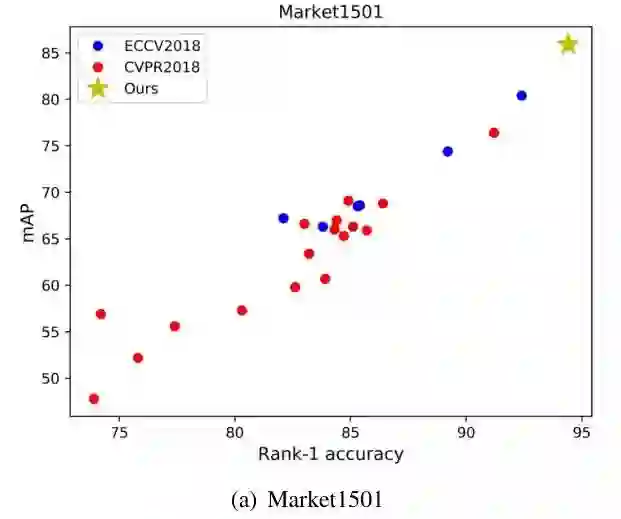 首先作者在Maket1501数据集上对比了ECCV2018和CVPR2018的一些baseline的性能,并与自己提出的baseline作对比,这些baseline大部分都是通过一些训练技巧来提升的,由于在论文中轻描淡写易被忽视,因此作者也建议评价一篇学术论文一定要把训练技巧考虑在内,这样才会更加客观。