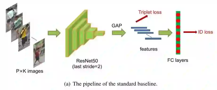 本文主要收集并介绍行人重识别(PersonReID)算法中的一些训练技巧,随着深度卷积神经网络的不断改进,行人重识别领域也有了很大的进步,但大多数的SOTA的算法都是设计了很复杂的网络结构和融合了多支路的特征。作者首先设计了一个强力的baseline, 然后尝试使用一个简单的全局特征,并融合了很多有效的训练技巧,使得模型在Market1501数据集上达到了94.5%rank-1以及85.9% mAP。