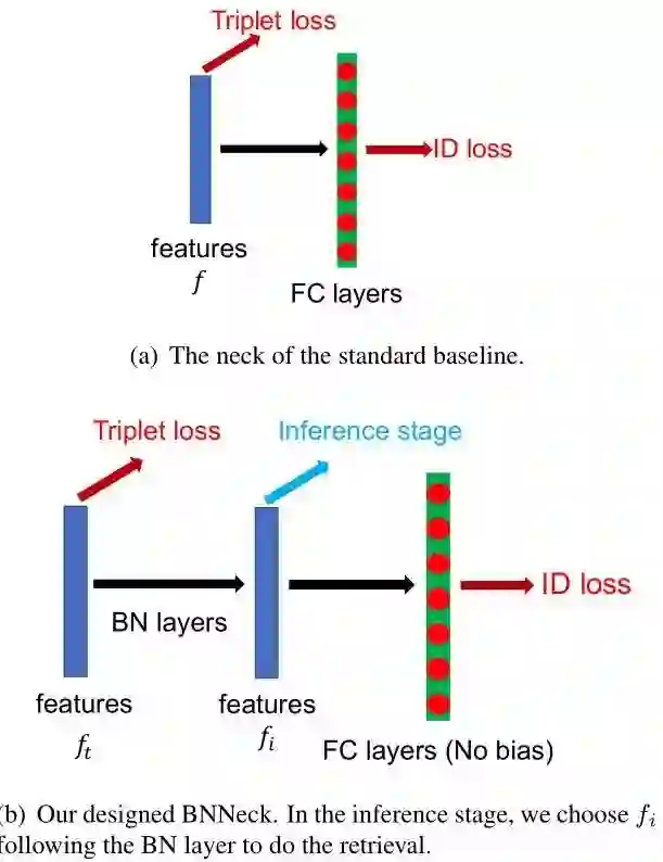 在行人重识别模型中,有很多工作都是融合了ID loss和Triplet loss来进行训练的,但是这种loss函数的目标并不协调,对于ID loss,特别在行人重检测,consine距离比欧氏距离更加适合作为优化标准,而Triplet loss更加注重在欧式空间提高类内紧凑性和类间可分性。因此两者关注的度量空间不一致,这就会导致一个可能现象就是当一个loss减小时另外一个在震荡或增大。因此作者设计了BNNeck用于解决这个问题,如下图: