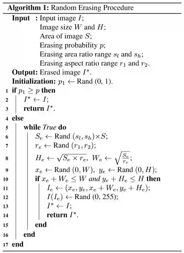这是进行分类问题常见的数据增强方式,对行人检测十分有效!在行人重识别中特别是现实生活中,大部分人体会存在遮挡的情况,为了使模型更具有鲁棒性,我们对每个mini-batch使用REA(RandomErasing Augmentation),REA随机选择一个大小为)的正方形区域,然后对这个区域的像素用一些随机值代替。其中擦除区域面积占比,擦除区域长宽比,,随机概率为0.5,具体算法如下: