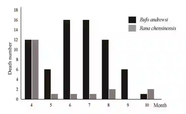 华西蟾蜍和中国林蛙在2017年不同月份的死亡数