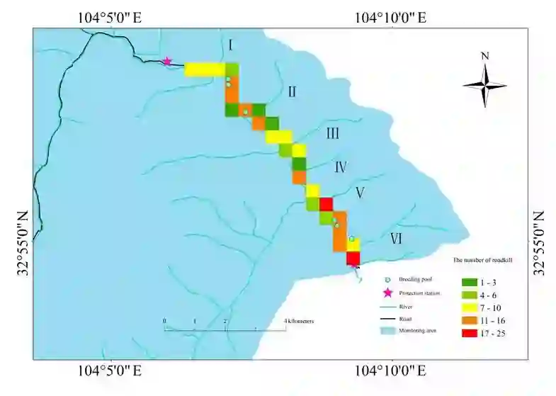 中国科学院成都生物研究所的硕士研究生章文艳,在导师、副研究员李成的指导下,与王朗自然保护区合作开展了保护区内道路致死两栖动物的研究。该研究选取了一条长10 km宽5.5 m的典型的山区四级公路,探究了两栖动物道路致死的时间和空间分布特点以及导致两栖动物死亡的诱因。结果表明两栖动物道路致死在时间和空间上是聚集分布的,两栖动物道路致死的高峰时期主要集中在4月、6月和7月,道路致死的高频地点主要发生在靠近繁殖点的路段上。通过广义线性模型分析了与两栖动物道路致死相关的7个环境变量,发现两栖动物道路死亡数和夜间车流量有着显著的相关性。早期的研究证实车流量是影响两栖动物道路致死的重要因素,据此管理部门出台了禁止在保护区内开展旅游的措施。而本文首次揭示了夜间车流量才是决定两栖动物道路致死的关键因素;最新的《科学》杂志上的一篇文章也显示,在高人类干扰的环境下,动物夜晚出来活动的时间增至原来的1.36倍,建议在动物最活跃的时期限制人类活动;这些研究为保护管理部门调整生态旅游的对策提供了科学依据。