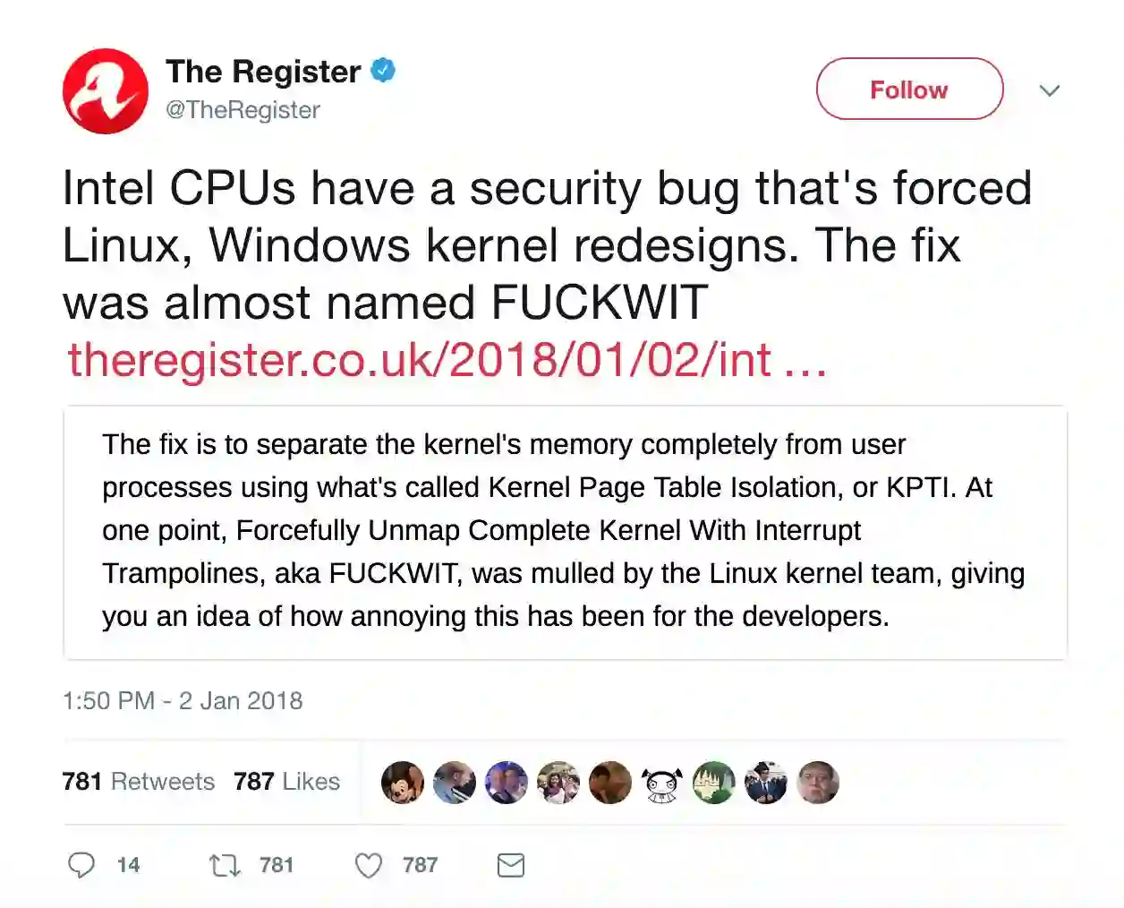 有安全人员强调,这是一个 Intel x86-64 处理器的设计缺陷,已经存在了逾十年。问题被曝出后,Linux 社区的开发者们都在加紧检修 Linux 的虚拟内存系统,并释出 Kernel Page Table Isolation 修复代码。与此同时,微软预计在下个补丁日发布对 Windows 系统的必要调整,其 beta 版本已经提供给测试者。苹果也会在即将发布的 10.13.3 更新中修复更多的内容。
