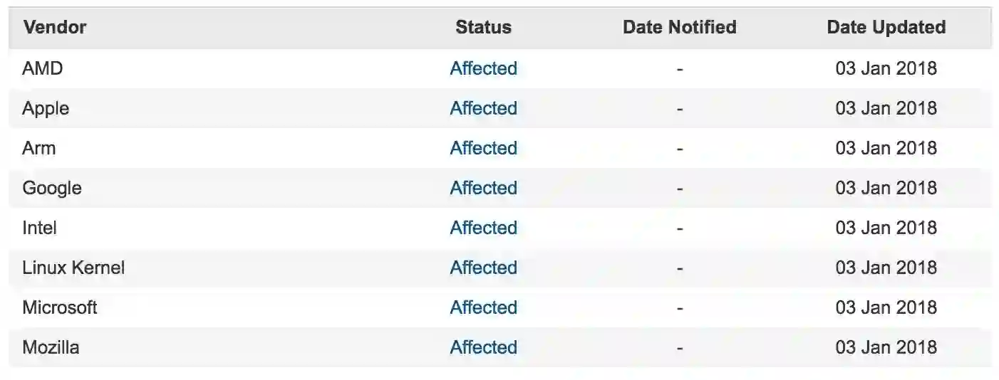CERT 还列出目前经已证实受影响的 CPU 厂牌和主要 OS 厂商: