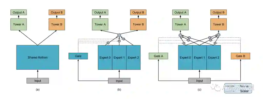 底层共享一部分参数,自己还有独特的一部分参数不共享;顶层有自己的参数。底层共享的、不共享的参数如何融合到一起送到顶层,也就是研究人员们关注的重点啦。这里可以放上咱们经典的MMOE模型结构(图3),大家也就一目了然了。和最左边(a)的hard sharing相比,(b)和(c)都是先对Expert0-2(每个expert理解为一个隐层神经网络就可以了)进行加权求和之后再送入Tower A和B(还是一个隐层神经网络),通过Gate(还是一个隐藏层)来决定到底加权是多少。(超纲部分:聪明的小伙伴看到这个加权求和,是不是立刻就想到Attention啦?要不咱们把这个Gate改为一种Attention?对不同专家的Attention来决定求和权重,那你得想办法设计Attention的query啦,是个有趣的点。)