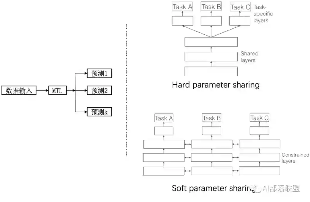 通常将多任务学习方法分为:hard parameter sharing和soft parameter sharing。区别在于对图1右边MTL那一个方块。