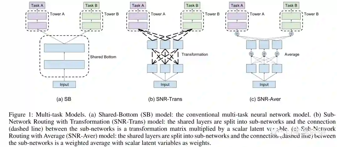 A . 竖着切了吃:对共享层进行区分,也就是想办法给每个任务一个独特的共享层融合方式。图3的MOE和MMOE模型就是竖着切了吃的例子。另外MMOE在MOE的基础上,多了一个GATE,意味着:多个任务既有共性(关联),也必须有自己的独特性(Task specific)。共性和独特性如何权衡:每个任务搞一个专门的权重学习网络(GATE),让模型自己去学,学好了之后对expert进行融合送给各自任务的tower,最后给到输出,2019年的SNR模型依旧是竖着切开了吃,只不过竖着切开了之后还是要每一小块都分一点放一起送给不同的流口水的人。(可能某块里面榴莲更多?)