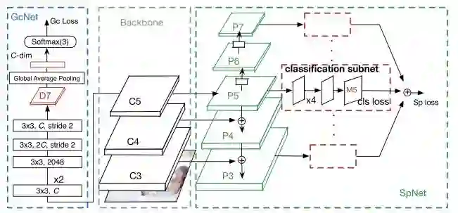 步骤二: 在仅有类别标注的数据集上训练,固定 SpNet 的参数,仅更新骨干网络和 GcNet 的参数,最小化分类损失。