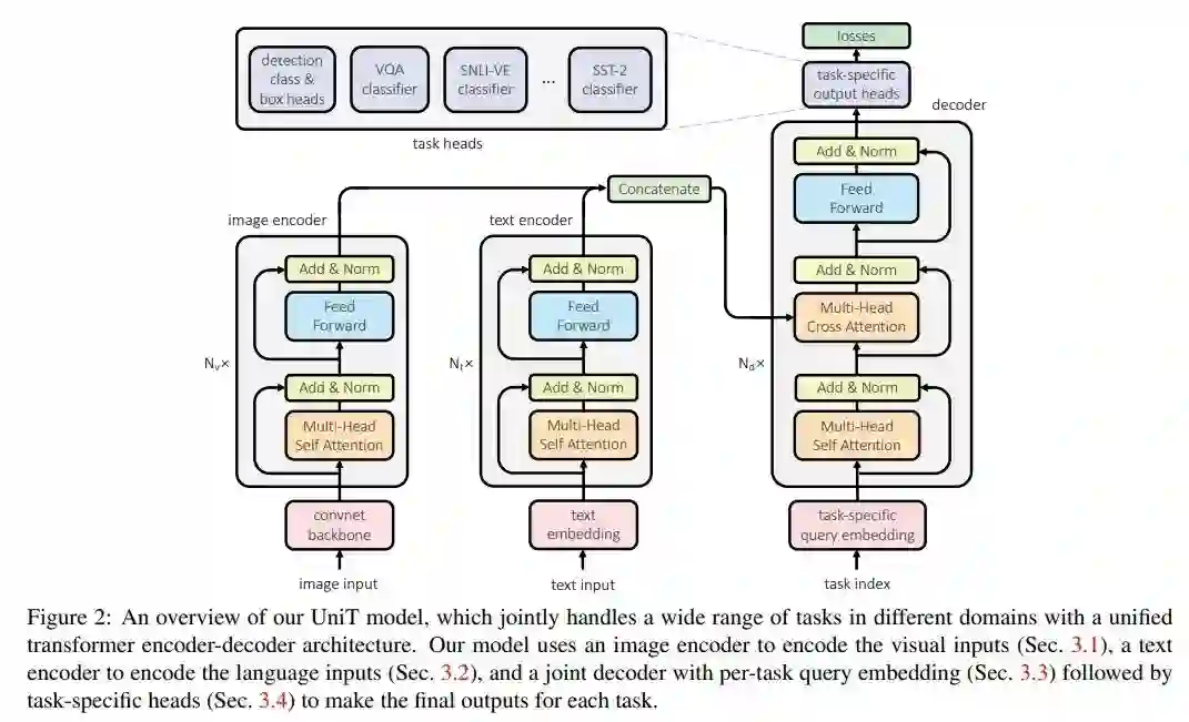 在本文中,来自 FAIR 的研究者提出了一个 Unified Transformer(UniT)模型,它可以同时学习不同领域的最重要任务,比如目标检测、语言理解和多模态推理。基于 Transformer 编码器 - 解码器架构,UniT 模型利用一个编码器编码每个输入模态,并利用一个共享解码器在每个任务上对解码后的输入表示进行预测,最后对特定于任务的输出头进行预测。整个模型通过每个任务的损失进行端到端地训练。与以往利用 transformer 的多任务学习不同,研究者在所有任务上共享相同的模型参数而不是单独微调的特定于任务的模型,并处理不同领域的更多样化的任务。在实验中,研究者在八个数据集上共同学习了七项任务,并在相同的监督下通过一组紧凑的模型参数,在每个领域均实现了媲美以往模型的性能。