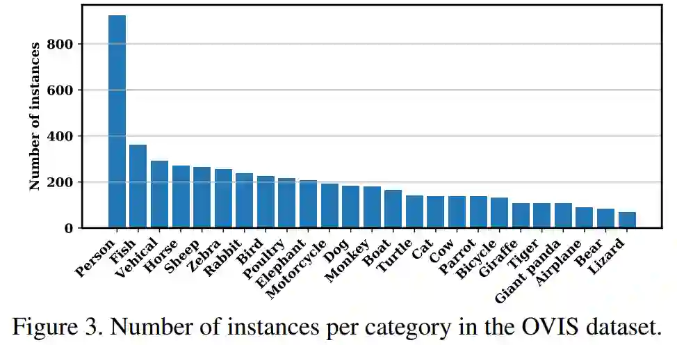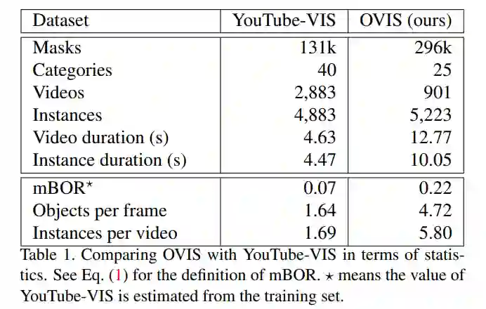 视频实例分割 (Video Instance Segmentation, VIS) 要求算法能检测、分割、跟踪视频里的所有物体。与现有 VIS 数据集相比,OVIS 最主要的特点就是视频里存在大量的多种多样的遮挡。因此,OVIS 很适合用来衡量算法对于遮挡场景的处理能力。实验表明,现有方法并不能在强遮挡场景下取得令人满意的结果,相比于广泛使用的 YouTube-VIS 数据集,几乎所有算法在 OVIS 上的指标都下降了一半以上。