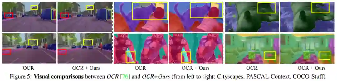 从左至右,在 Cityscapes、PASCAL-Context 和 COCO-Stuff 数据集上,OCR 和 OCR 结合本研究方法的视觉对比结果。