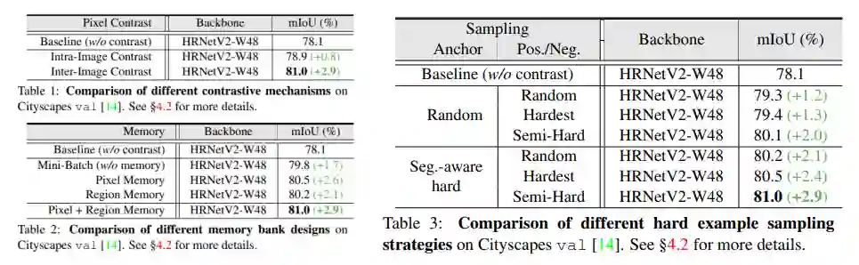 Cityscapes val 上不同对比机制、不同内存块(memory bank)设计和不同难例采样策略之间的对比结果。