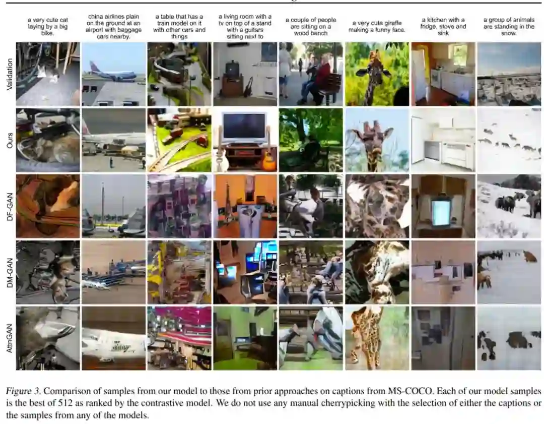 在 MS-COCO 数据集中的数据标注(caption)上,该研究所提模型生成的样本与基于以往方法(如 AttnGAN、DM-GAN 等)生成的样本之间的对比。