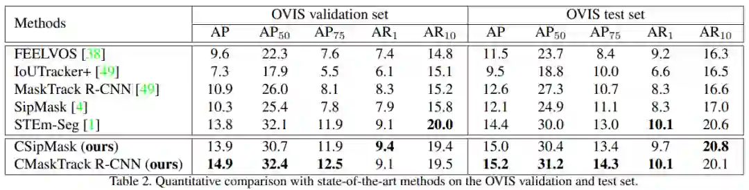 OVIS 验证和测试集上,CSipMask 和 CMaskTrack R-CNN 与 SOTA 方法的定量对比结果。