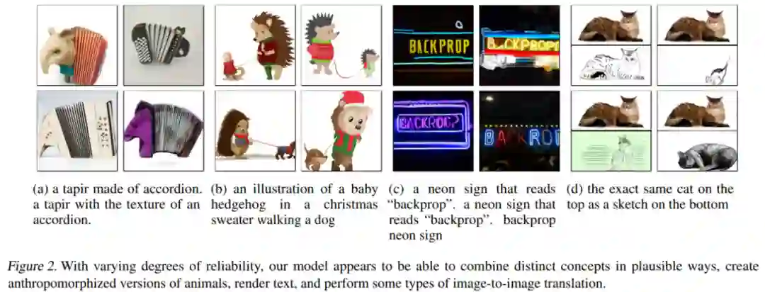 在不同信任度时,该研究提出的模型能够以合理的方式结合不同的概念,创建拟人化的动物形象,渲染文本,并执行一些类型的图像到图像转换。